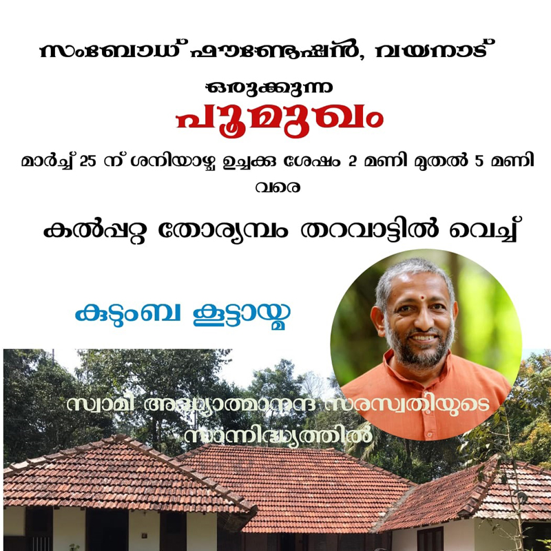The Sambodh Foundation Kerala's objectives are centered on realizing a vision of uplifting and empowering humanity as a whole, without any discrimination based on factors such as caste, creed, color, religion, or gender. This mission is pursued through the provision of spiritual and philosophical education rooted in the study and practice of Vedantic scriptures and Indian culture.
